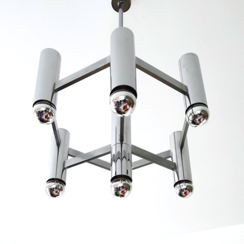 A beautiful vintage chandelier in honeycomb design by the Italian designer Gaetano Sciolari for Boulanger. This chrome chandelier has 7 light points (E14 socket), has been tested and works perfectly. It’s in good condition for its age and a real eye-catcher with its geometric design!