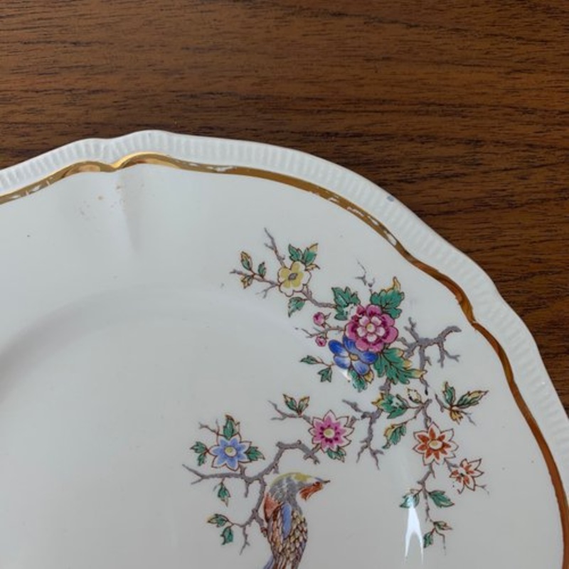 Set of 10 dessert plates, "Chantilly" model by Longchamp, 1950/60Crane and flower decor in Japanese style with gold accentDimensions: 19.5 x 19.5 cm - height: 1 cmOld object, retains traces of time (discoloration of the decoration in certain places, small