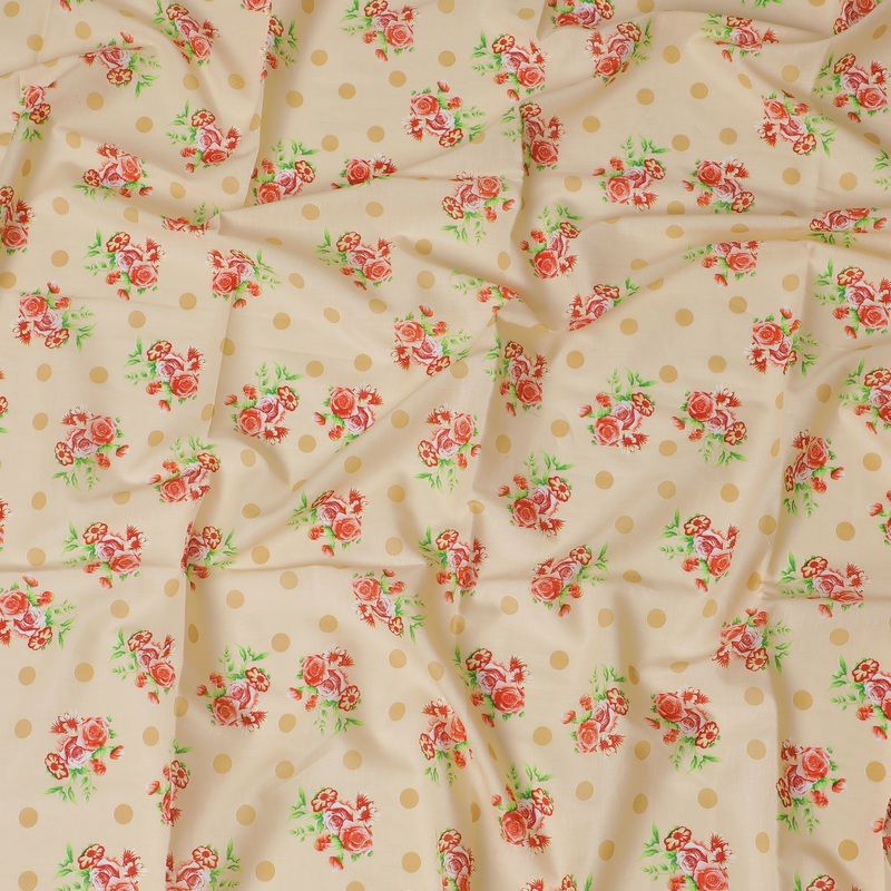 Charming Beige Cotton Fabric with Red Roses and Polka Dots, Last Piece, 110 cm Width-D19331(2.5Mtrs Piece)