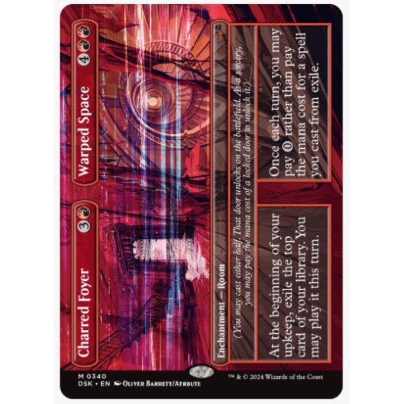 Charred FoyerAt the beginning of your card of your upkeep, exile the top card of your library. You may play it this turn/Warped SpaceOnce each turn, you may pay 0 rather than pay the mana cost for a spell you cast from exile.Rarity:M#:340Card Type:Enchantm