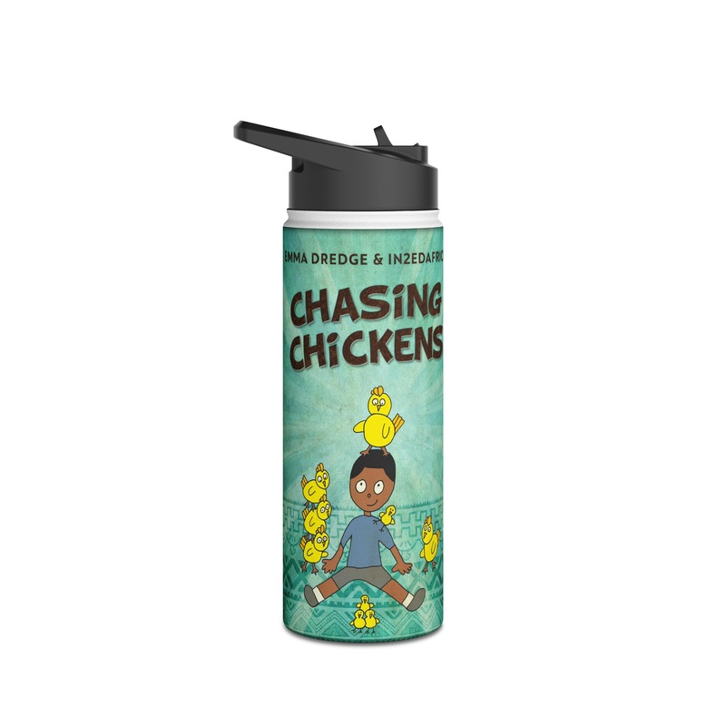 Quench your thirst in style with this 18oz stainless steel water bottle featuring a double-wall stainless steel build that keeps your drinks frosty for 24h and soothingly hot for 12h. This BPA-free, steel water bottle comes with a twist-on lid for easy sipping, making it excellent for daily use at work, at college, in the car, and beyond. The cover art in this water bottle is from Emma Dredge’s book, Chasing Chickens.