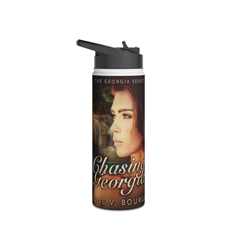 Quench your thirst in style with this 18oz stainless steel water bottle featuring a double-wall stainless steel build that keeps your drinks frosty for 24h and soothingly hot for 12h. This BPA-free, steel water bottle comes with a twist-on lid for easy sipping, making it excellent for daily use at work, at college, in the car, and beyond. The cover art in this water bottle is from June V. Bourgo’s book, Chasing Georgia.