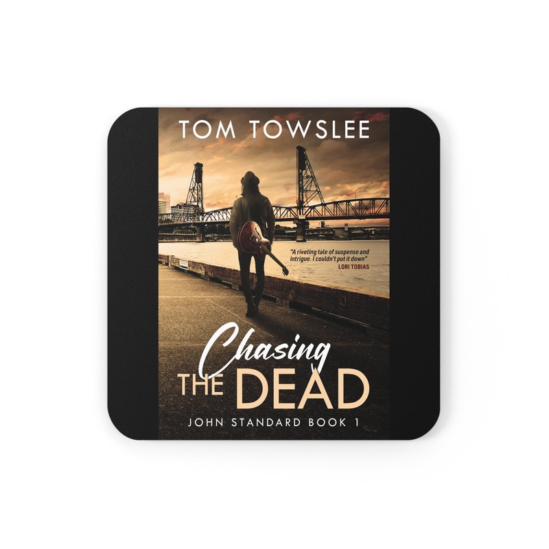 These coasters are made with a high-gloss top and feature a cork back to prevent sliding, and each order comes with a set of four coasters. The cover art in these coasters is from Tom Towslee’s book, Chasing The Dead (John Standard Book 1).