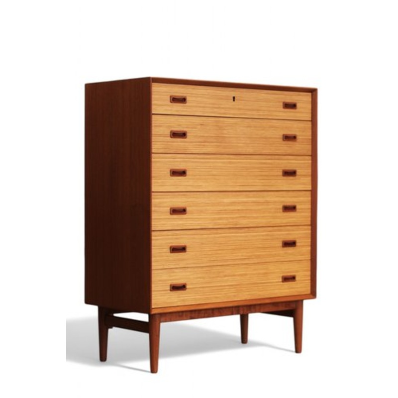 A very well built and stylish chest of drawers designed by Gunni Omann for Omann Jun in Denmark.The bureau is in teak with model number 130 and has six drawers, the top one of which is slightly shallower. All drawers are furnished in light wood and are stu