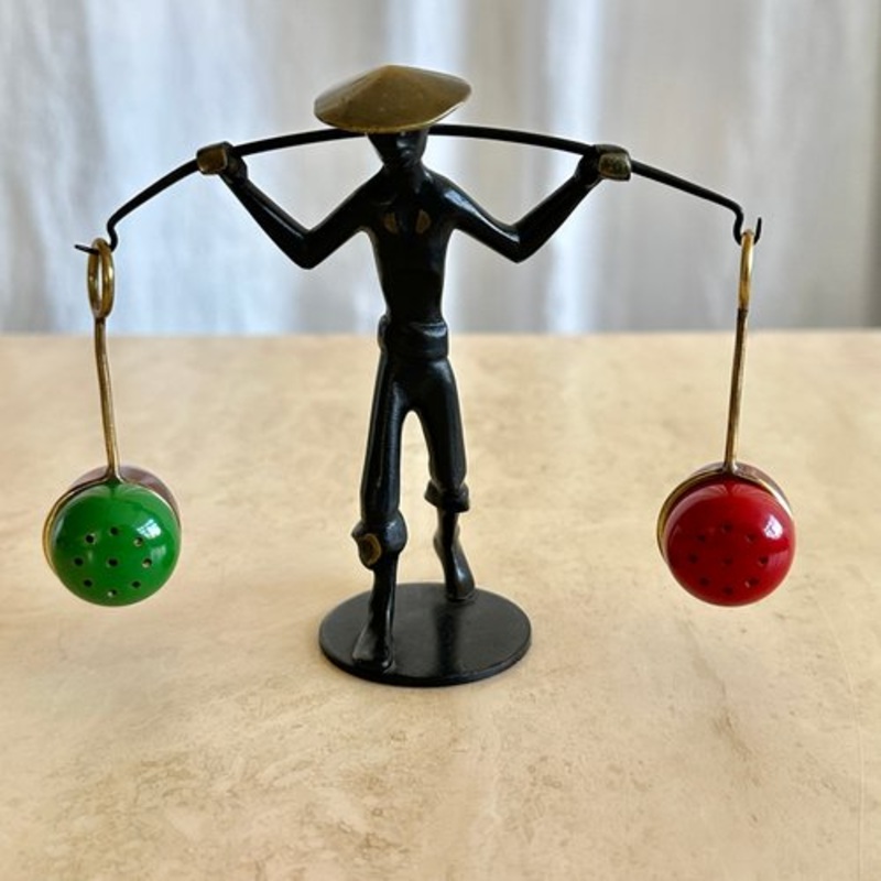 Astonishing and very rare Chinese figurine salt and pepper holder by Richard Rohac, Austria, 1950s. It is hard to provide a worthy of this cutie, because its aesthetic experience cannot be fully grasped without the personal encounter. A piece to fall madly in love with, which fulfils its function, while carrying features of a work of art and having a special aura. The colour combination, the intricately fabricated details and fine shapes constitute a crown jewel for any dining room or kitchen setting. It is guaranteed that seasoning with this cutie will hit different. Perfect piece for modern and traditional home interiors, not only for culinary/gourmet enthusiasts.