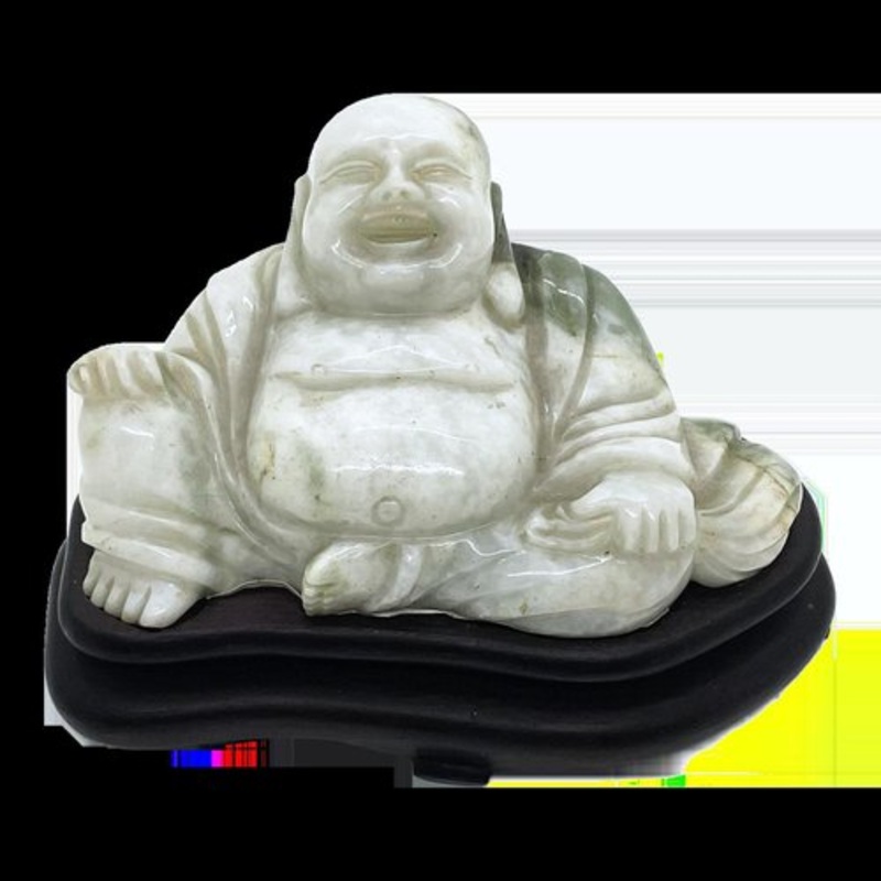 Jadeite carved Budai Vintage Antique Laughing Buddha early to mid 1900s carved from natural Burmese jade fine and detailed workmanship Read more Jadeite carved Budai Vintage Antique Laughing Buddha early to mid 1900s carved from natural Burmese jade fine and detailed workmanship snow color with spinach green zones with wooden base weight without base 202.5 g baseless measurements length 9 cm height 6 cm depth 5 cm in very good condition for its age.