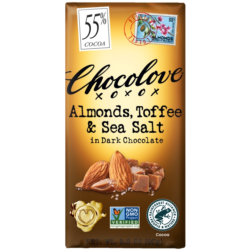 Premium Belgian dark chocolate with sweet almond toffee, whole dry roasted almonds & sea salt55% CocoaInspired by a French love of salted caramels and almondsSweet, buttery toffee combines perfectly with crunchy almonds and sea salt crystalsDark Chocolate(