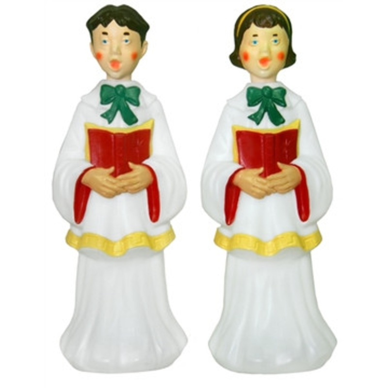 These classic Christmas blow mold lighted Carolers are a must for your outdoor decor. Purchase a few sets and create an entire choir. You will receive both the Choir Boy and Girl. Set of 2 Needs a 60 watt bulb (not included). White electrical cord with soc