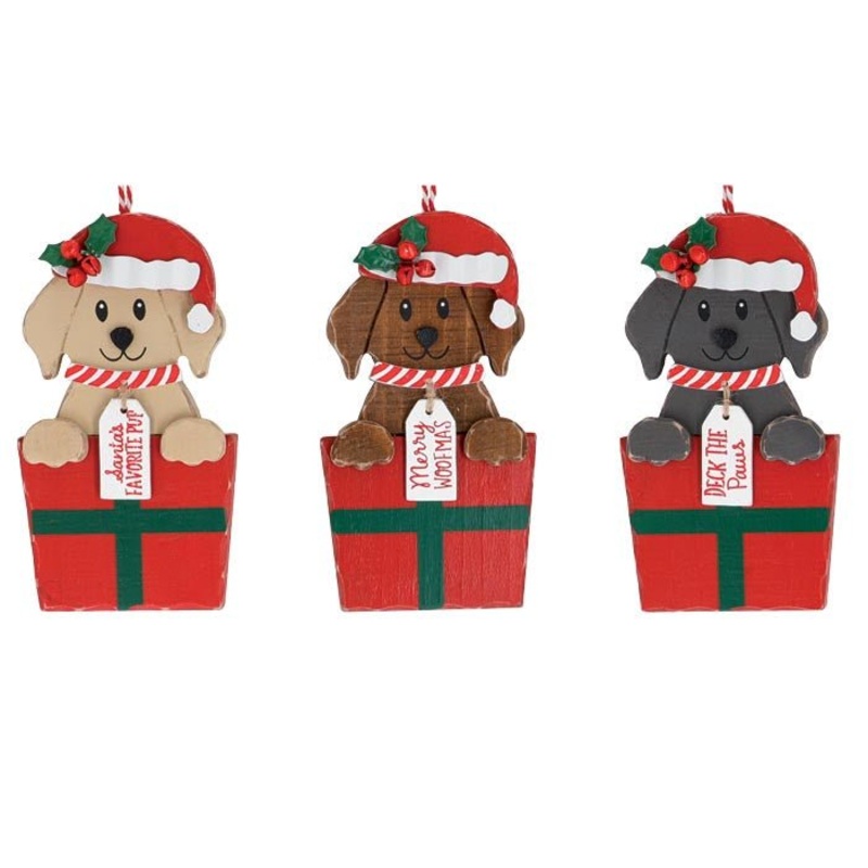 6" Wooden Dog in Christmas giftbox ornament. Sold individually. Choose by color - Tan, brown, or gray. Each has a different saying on the gift tag! Perfect sign for a dog lover's wreath! Just add some of our paw print or dog print ribbons to finish it off!