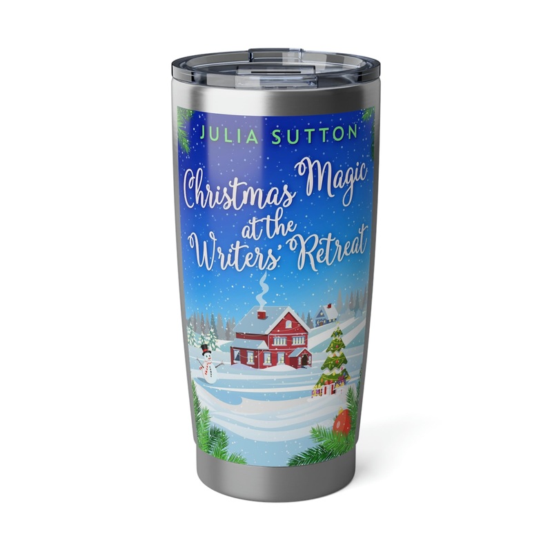 Minimize your plastic footprint with style. This tumbler fits perfectly into car cup holders, and the rubber gasket makes it spill-resistant on bumpier roads. The double-wall insulation makes sure drinks stay at the right temperature until the next pit stop. The cover art in this 20 oz tumbler is from Julia Sutton’s book, Christmas Magic At The Writers’ Retreat.