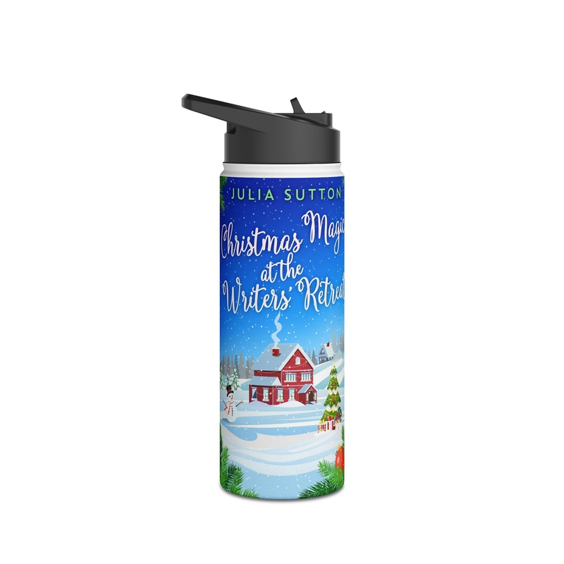 Quench your thirst in style with this 18oz stainless steel water bottle featuring a double-wall stainless steel build that keeps your drinks frosty for 24h and soothingly hot for 12h. This BPA-free, steel water bottle comes with a twist-on lid for easy sipping, making it excellent for daily use at work, at college, in the car, and beyond. The cover art in this water bottle is from Julia Sutton’s book, Christmas Magic At The Writers’ Retreat.