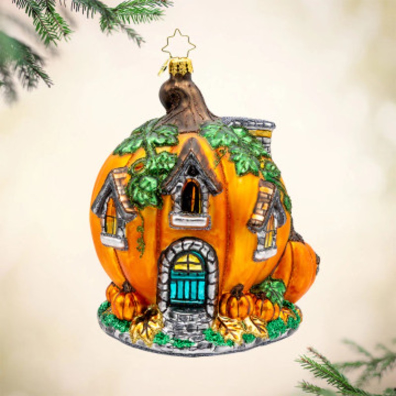 NEW for 2025 Bring charm and cozy Halloween magic to your dcor with this whimsical glass ornament from Christopher Radko. Shaped like a cheerful orange pumpkin house, it features peaked windows, a stone-trimmed arched blue door, and a leafy green glittered