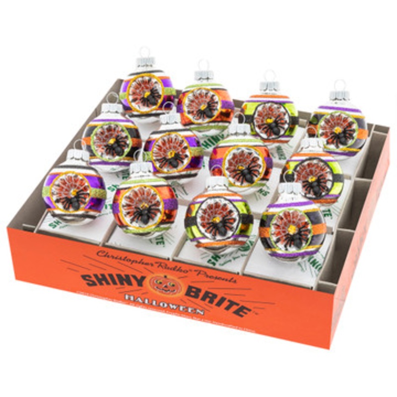 These gorgeous rounds feature glittering and metallic stripes with silver spiderweb reflectors dotted with a small spider!Made by Christopher Radko.Made of glass.Dimensions: 1.75″.Item #: 4028050