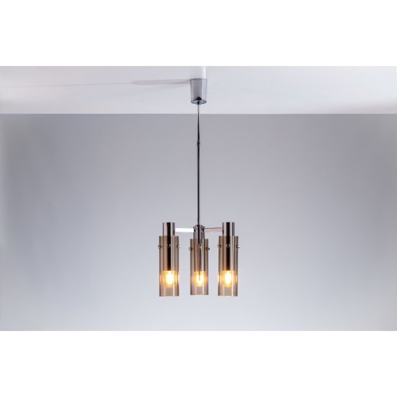 This sleek chrome pendant light is a stylish and modern addition to any space, featuring three lightpoints that each showcase a cylindrical smoked glass shade. The glass offers a sophisticated, smoky hue that casts a soft, ambient glow, perfect for creatin