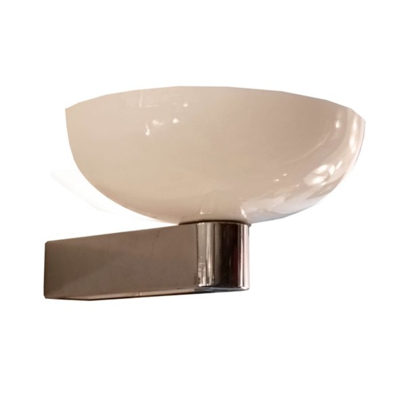 The lamp features a clean, minimalist design typical of the Italian style of the 1950s. The combination of blown milky glass and chrome-plated brass is a classic from that period.The lamp consists of a white glass shade in the shape of an inverted bowl and
