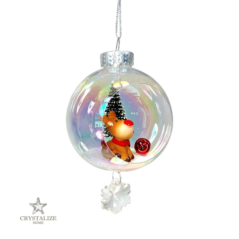 This magical ornament features an adorable chubby reindeer seated next to a red bell and sparkling pine tree inside a circular iridescent terrarium-style ornament. A removable magnetized sparkling, snowflake-cut crystal charm dangles from the bottom. A protective gift box is included making this ornament ready for gifting as soon as it arrives to you!