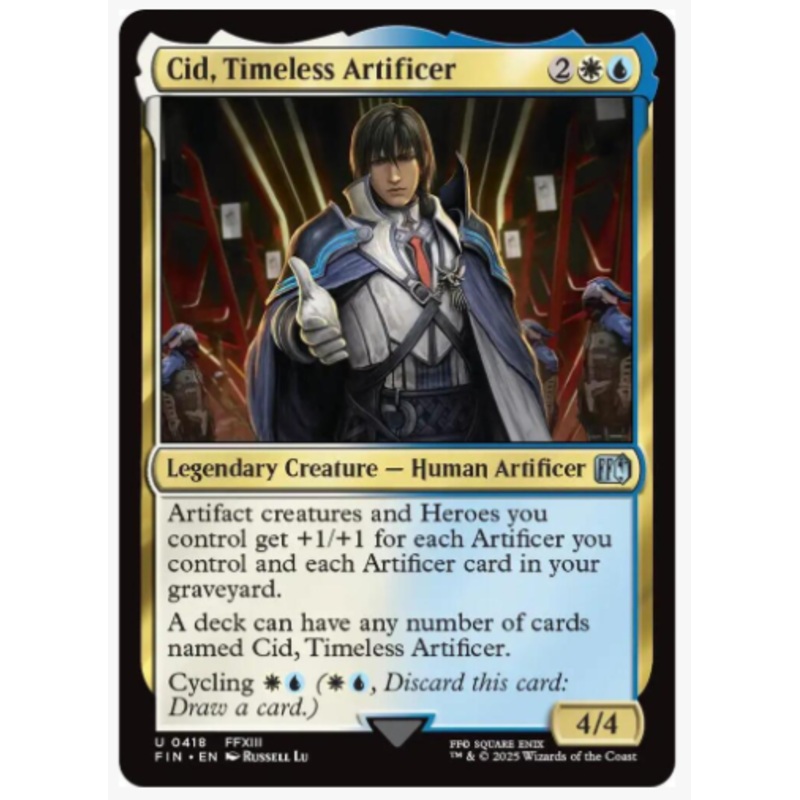 Artifact creatures and Heroes you control get +1/+1 for each Artificer you control and each Artificer card in your graveyard.A deck can have any number of cards named Cid, Timeless ArtificerCycling WU(WU, Discard this card: Draw a card.)Rarity:U#:418Card T