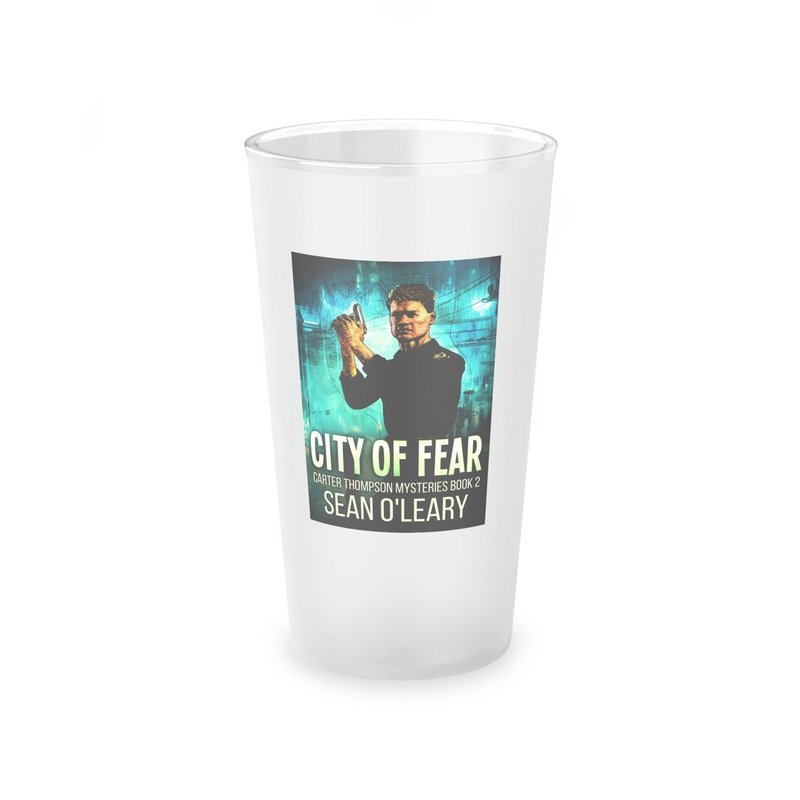 This frosted matte finish pint glass is versatile and dishwasher-safe. The cover art in this pint glass is from Sean O'Leary's book, City Of Fear.
