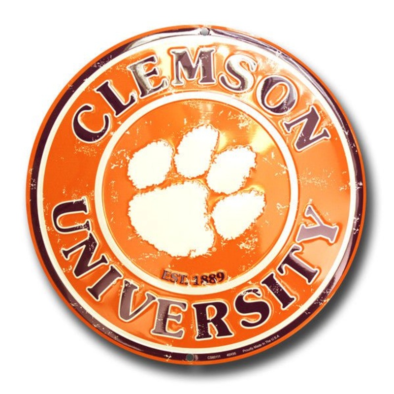 Officially licensed 12" Clemson University Collegiate Embossed Metal Circular Sign. Made of high quality aluminum for a weather resistant finish. This sign has a weathered/vintage look. It is lightweight & durable. Pre-drilled holes for quick and easy moun