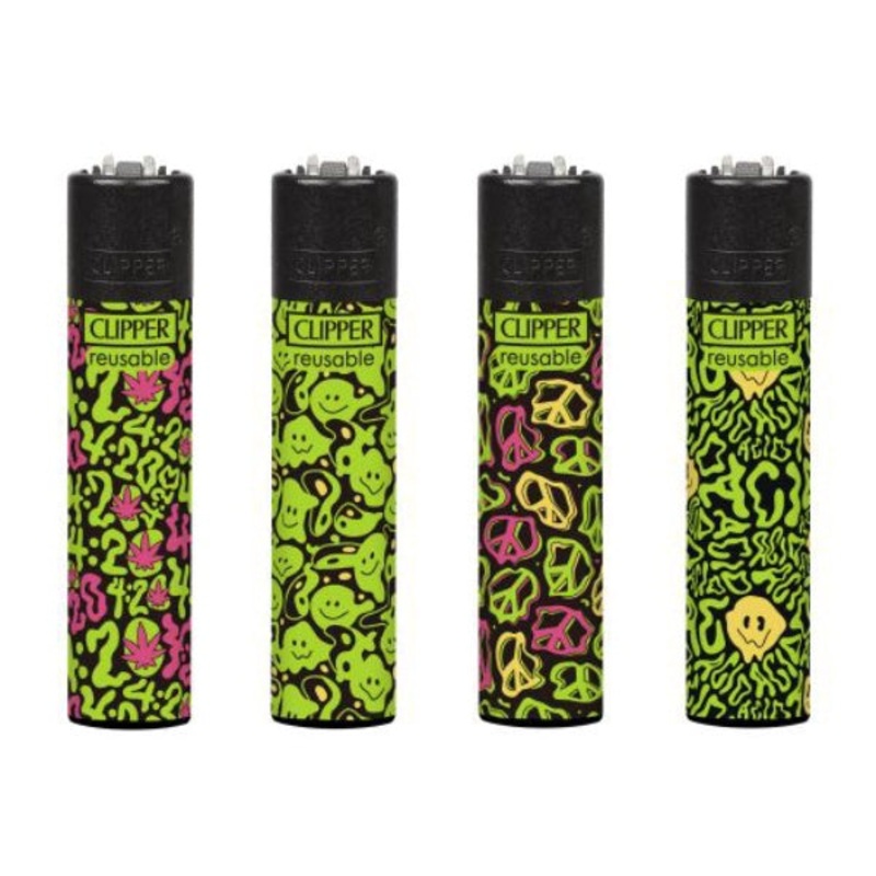 Designed by Gizeh (Germany) the Acid Pattern Clipper is loaded with vibrant colours, meltin faces, peace signs and Yin Yang. Each comes backed in Neon Green or Pink with a splash of Black and Yellow. These lighters are bound to spark up some psychadelic 90