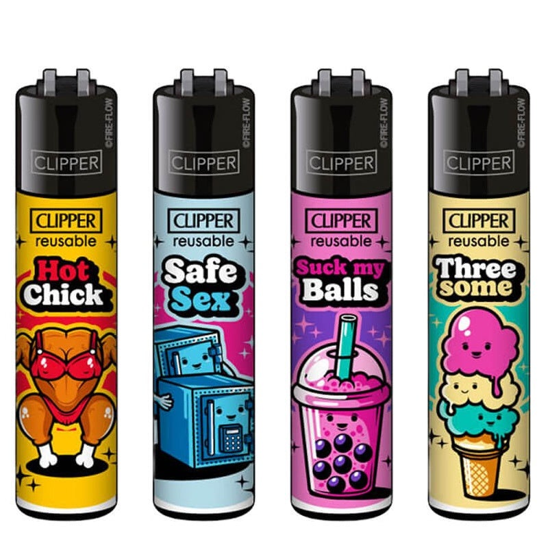 Turn your sesh into a filthy little flick with the Porn Slogans 7 collection from Clipper a downright dirty lineup of innuendo-loaded lighters that dont beat around the bush! These softcore stoner smut stars will leave your fingertips sweaty – from bubble teas begging you to suck every last ball, to spit-roasted hot chicks getting double stuffed in creamy, dreamy threesomes who needs the safe sex… unlock the box and go straight for the money shot!!