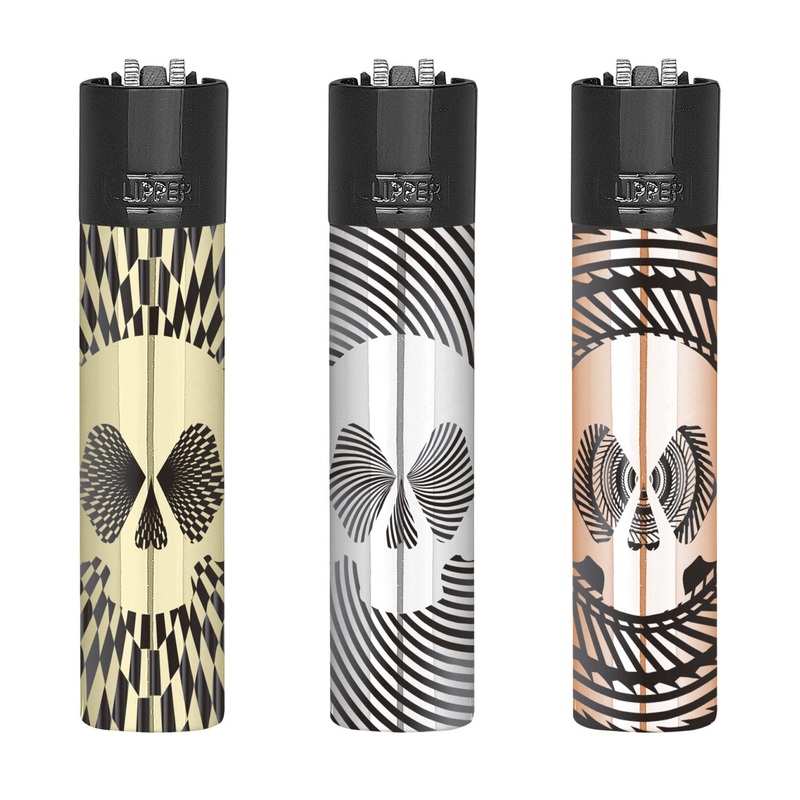 Illuminate your style with the 'Amazing Skulls' hot foil Solid Metal Clipper lighters, featuring vibrant, psychedelic skull designs that radiate in Gold, Silver or Rose Gold with a sleek black top. These premium lighters bring bold, trippy energy to any co