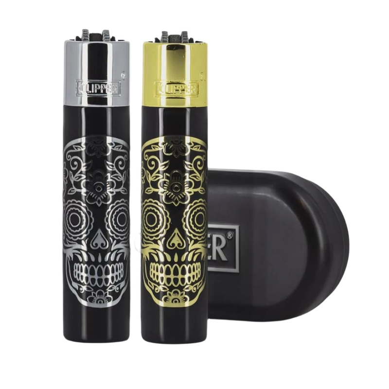 Strike up some calavera flair with this electrifying set of metal Clipper lighters: “Mexican Skulls” features bold, shiny illustrations inspired by Mexicos iconic Day of the Dead candy skulls.