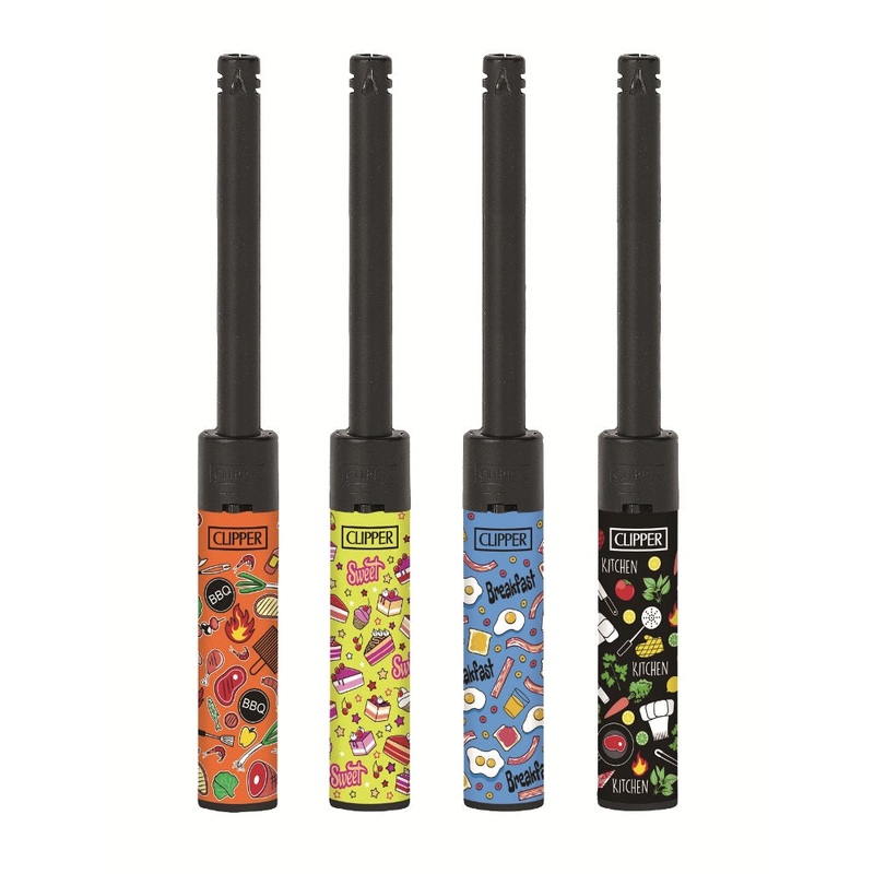 Live out your culinary desires with these Clipper Tube Plus extra long-tube utility lighters featuring some funky food themed designs. The extra long-tube design and one-click ignition allow you to angle the lighter downwards to light cookers, bbq's, candl
