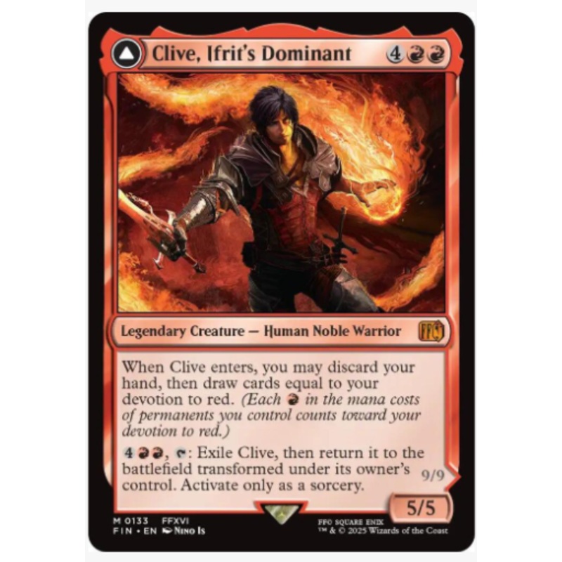 When Clive enters, you may discard your hand, then draw cards equal to your devotion to red.(Each R in the mana costs of permanents you control counts toward your devotion to red.)4RR : Exile Clive, then return it to the battlefield transformed under its o