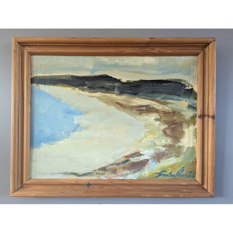 A serene mid-century modernist coastal landscape that captures the essence of a tranquil shoreline, executed in oil onto board and dated 1977 on the reverse. The work exhibits an abstract, yet expressive style, characterised by a loose, painterly approach, and focuses on the interplay of form and colour as opposed to realistic details. The artist has used broad and gestural brushstrokes, creating a sense of movement and fluidity. The use of short expressive dabs used to paint the landscape and sky contrasts with the smooth, almost ethereal handling of the water and sand, which adds character to the painting. A harmonious palette of soft blues, whites, and muted earth tones dominate the work, infusing the scene with a calming aesthetic. The cool blues of the water contrast gently with the muted sands, while touches of olive green and yellow along the shore evoke the natural beauty of the scene. This oil on board is housed in a complementary solid wood frame. The painting is in excellent vintage condition. The frame has some scuffing as shown. Size: 46 x 58.5 cm (including frame)