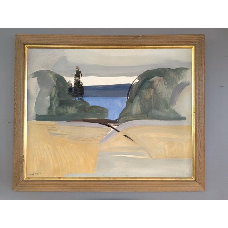 A large mid-century abstract landscape painting that captures a tranquil coastal scene framed by lush greenery and golden landscapes, executed in oil onto canvas. A narrow inlet leads the eye toward the deep blue waters of the sea, while sandy, golden-hued landforms in the foreground create a sense of depth and movement. The sky is rendered in soft muted greys and blues, suggesting an overcast or serene atmosphere. Executed in a modernist style, the painting features bold, simplified forms with an emphasis on geometric shapes and harmonious composition. The colour palette consists of earthy greens, warm yellows, and calming blues, all applied with expressive and fluid yet controlled brushstrokes. Some areas show broad, sweeping strokes, while others feature more deliberate, textured applications of paint, giving the work a dynamic yet balanced feel. The artists approach conveys a sense of both structure and spontaneity, reminiscent of mid-century landscape abstraction. This oil on canvas is housed in a well-suited wide profile wood frame with an inner gilt border. The painting is in excellent vintage condition. The frames gilt border has some wear as shown. Size: 76 x 93.5 cm (including frame)