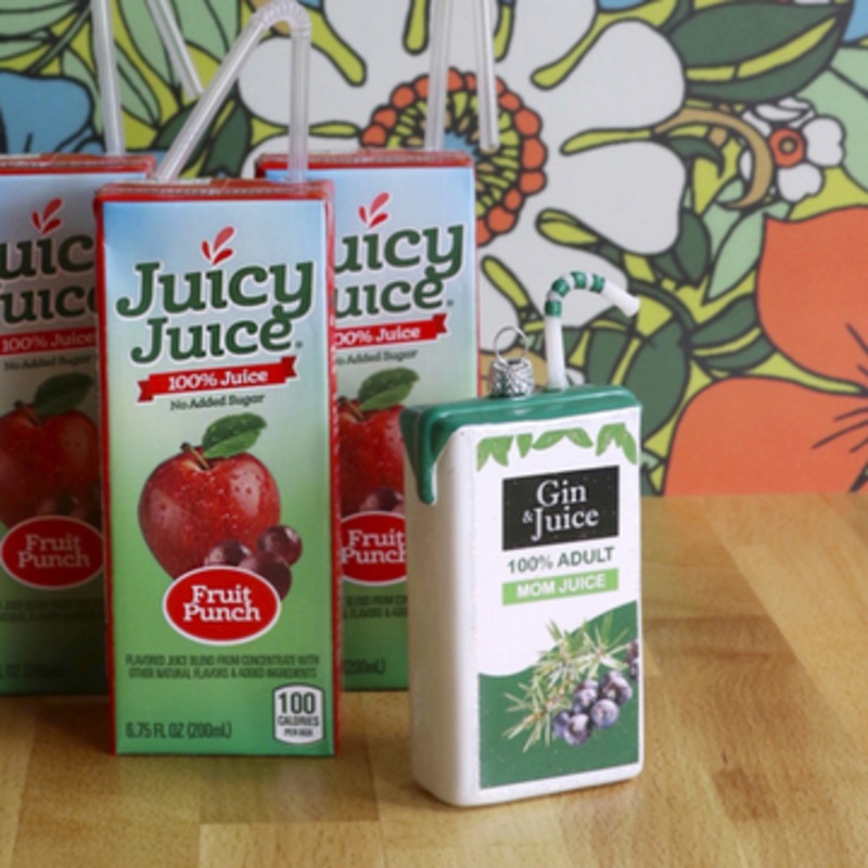 NEW for 2024 Sometimes you need a lil something to take the edge off... Especially during the Christmas season! This ornament features a juice box shape with 'gin & juice 100% Mom Juice' on the front and a straw poking out of the top!Made by Cody Foster.Ma