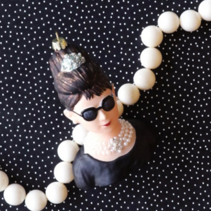 NEW for 2023 Are you a classic film lover?? Then we know you'll love this ornament! It features Audrey Hepburn in her iconic black dress with matching black sunglasses and ornate necklace laying across her chest! Her hair is pinne4d up in her signature up-