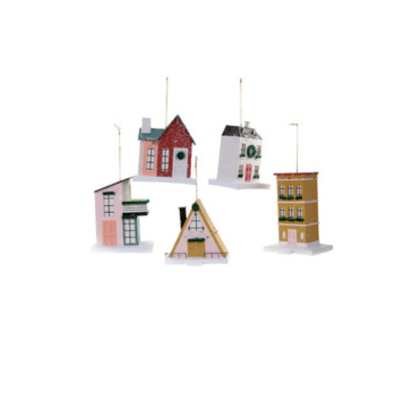 NEW for 2024 Have your very own Christmas village hanging around your tree this holiday season! This Christmas ornament features 5 colorful vintage inspired kitsch houses each with their own unique style!Sold as a set of 5.Made by Cody Foster.Item #: HOU-3