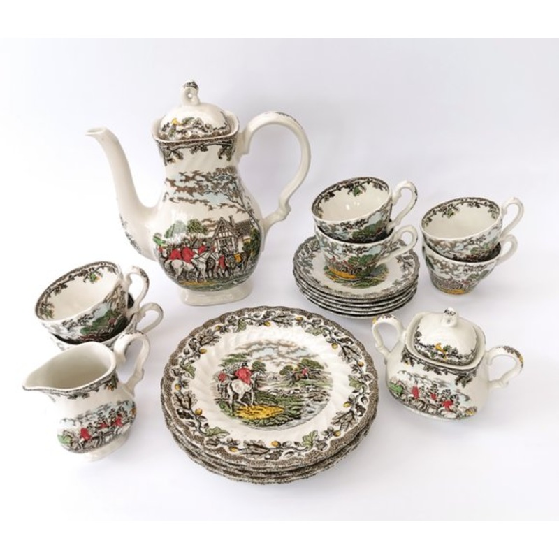 This coffee/tea service from the 'Country Life' series from Myott dates from the 1960s.It was only exhibited in a showcase for decoration and therefore never used.It is for 6 people (plates, sauces, cup) and also includes a coffee/teapot, sugar can and mil