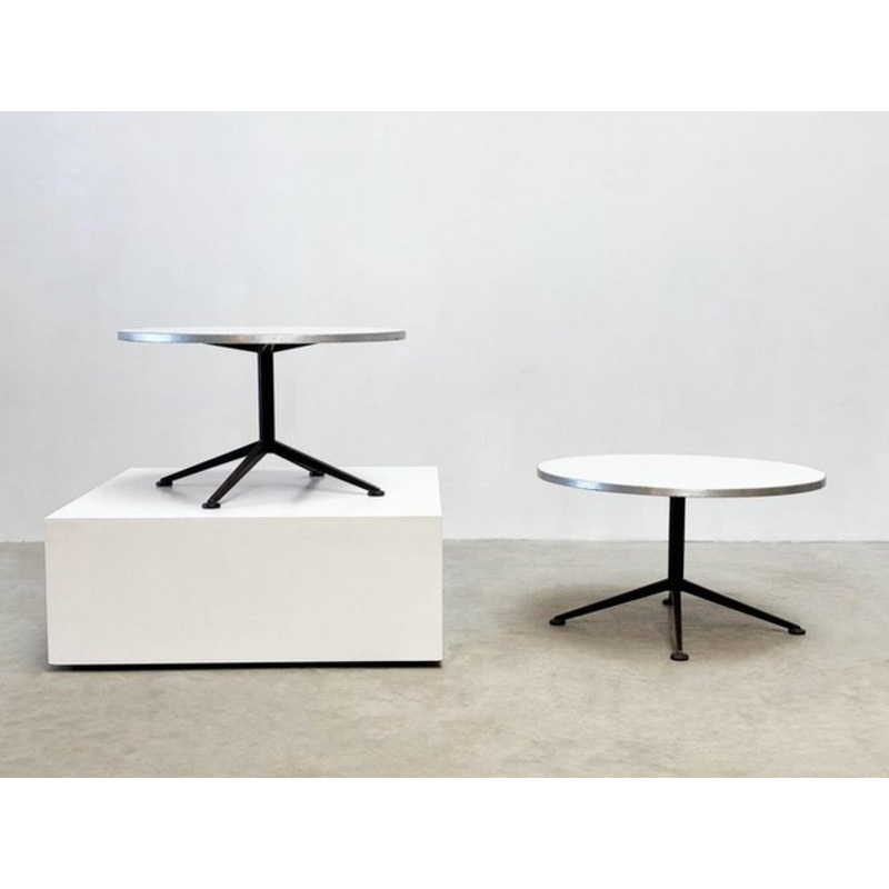 Discover an iconic round coffee table by renowned designer Friso Kramer, crafted in 1964 by Ahrend de Cirkel and originally showcased at Eindhoven Technical University. Its sleek design features a pristine white Formica top with an aluminum edge, perfectly