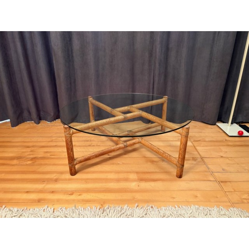 McGuire coffee table from the 1970s. In original and good condition. Surface scratches on the top and base consistent with age and explantation. Excellent quality of workmanship from thick rattan connected with natural leather straps. The top is made of thick, tempered glass. The table is signed with a brass label.