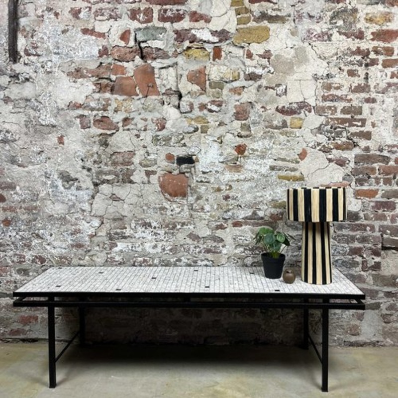 Vintage coffee table with mosaic top of white and black tiles with black lines on them. The base is black (painted) metal. Beautiful as a side table or with a nice cushion on top as a bench. 141 l x 39 d x 40 h