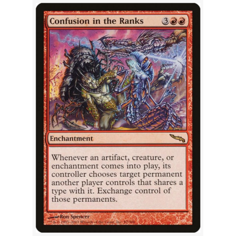 Whenever an artifact, creature, or enchantment comesinto play, its controller chooses target permanent another player controls that shares a type with it. Exchange control of those permanents.Rarity:R#:87Card Type:EnchantmentCasting Cost: 3RR