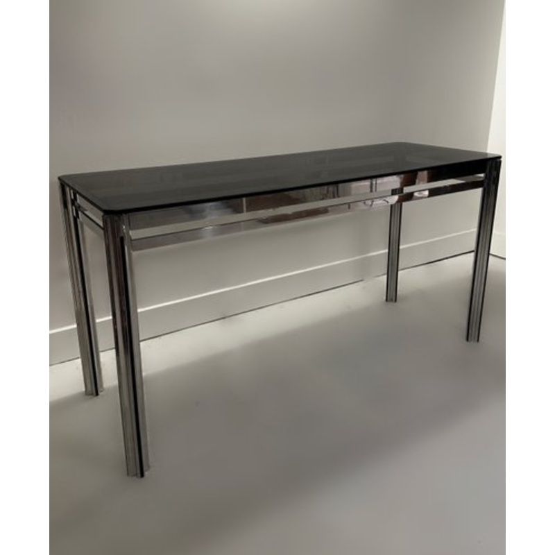 The George Ciancimino chrome and smoked glass console table from 1977 is a striking example of minimalist modernism. Featuring a sleek, architectural frame in polished chrome, the table exudes a refined, industrial elegance. The smoked glass top, floating