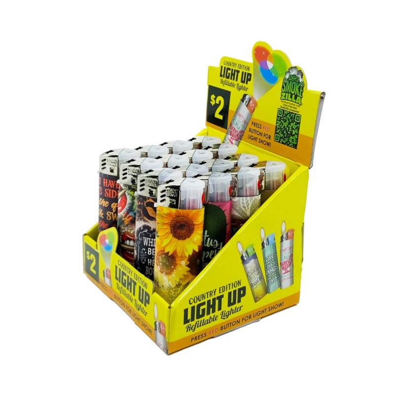 Light-up Country Girl themed Lighters with built-in light show. Comes in assorted colors and sayings. -REFILLABLE- -Display is pre-priced at $2.00 per piece-