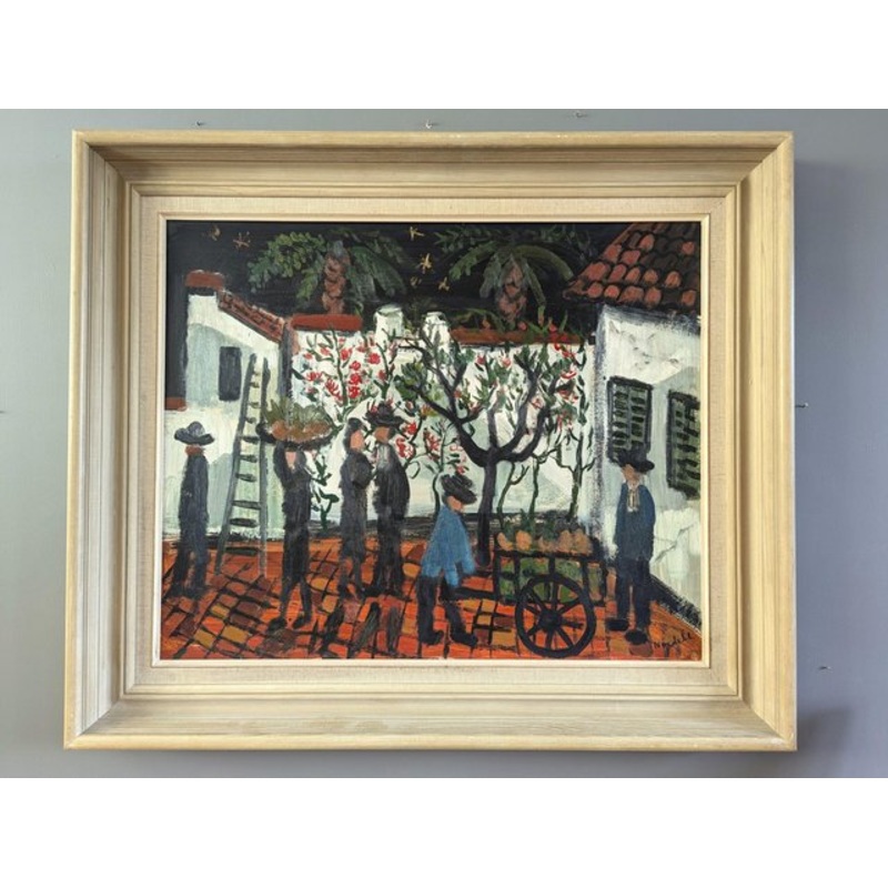 An expressive and nave style mid-century figurative painting, executed in oil onto canvas. The composition captures a courtyard scene where a group of figures, dressed in dark clothing and wide-brimmed hats, are engaged in harvesting and transporting produce. Two trees with delicate red blossoms stand in the center, adding vibrancy to the composition, while a figure in blue pushes a wooden cart filled with fruit. The painting is executed in a nave or folk-art style, characterised by simplified forms, a lack of precise perspective, and a slightly flattened spatial composition. The figures are stylised, with minimal detail. The artist has used loose, expressive brushstrokes with light texture, contributing to the paintings lively and dynamic quality. This oil on board is housed in a complementary frame with an inner linen border. The painting is in excellent vintage condition, and the frame has very minor scuffing. Size: 64.5 x 75 cm (including frame)