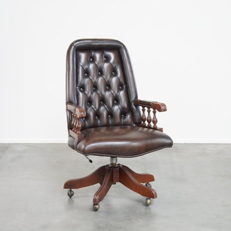 This spacious swiveling and tilting cowhide leather Chesterfield office chair in a beautiful color. Style and comfort in one. That sums up this Chesterfield office chair. Due to responsible use, it has suffered some normal signs of wear, but structurally i