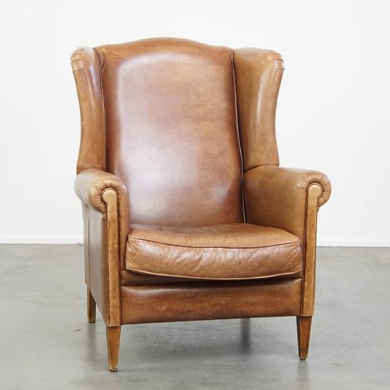 Charming, timeless and characterful cowhide leather wing chair in a light cognac color finished with a self-colored piping. Looking for a charming and stylish place to relax? Then this cowhide leather wing chair is a great asset for you! Its light cognac color and self-colouring piping give it a timeless character that radiates peace and tranquility. It is equipped with a loose seat cushion and has excellent seating comfort. It has suffered signs of wear through years of use, see photos. Structurally it is in good condition and can of course be used immediately. with proper use and maintenance, this fine wing chair can provide you with many years of seating and viewing pleasure. Dimensions: Height: 106 cm Width: 81 cm Depth: 91 cm Seat height: 45 cm Seat depth: 56 cm