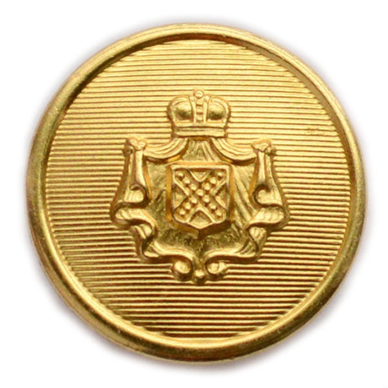 Brass (gold) metal blazer button, embossed with a crest with the royal crown. Metal loop shank backing. (Made in USA by Waterbury)