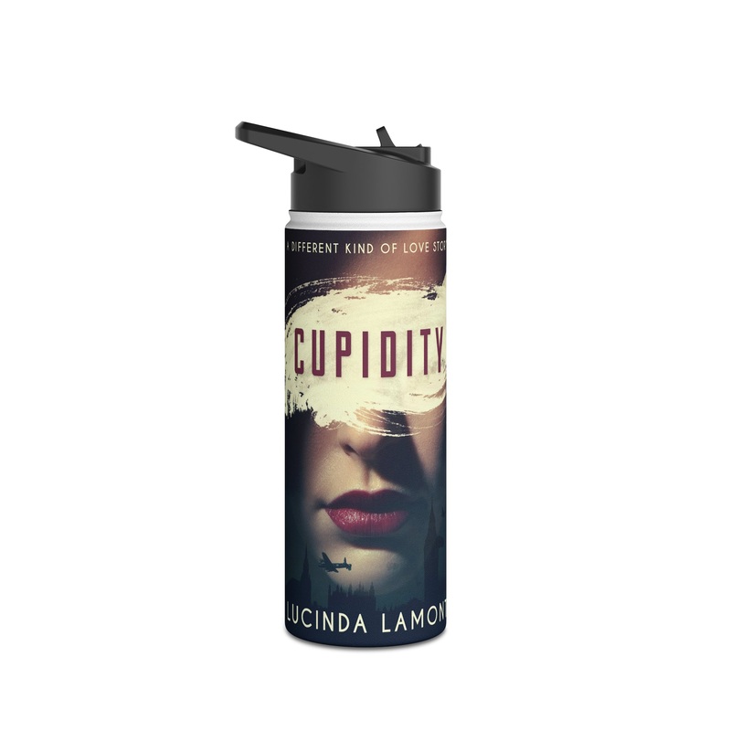 Quench your thirst in style with this 18oz stainless steel water bottle featuring a double-wall stainless steel build that keeps your drinks frosty for 24h and soothingly hot for 12h. This BPA-free, steel water bottle comes with a twist-on lid for easy sipping, making it excellent for daily use at work, at college, in the car, and beyond. The cover art in this water bottle is from Lucinda Lamont’s book, Cupidity.