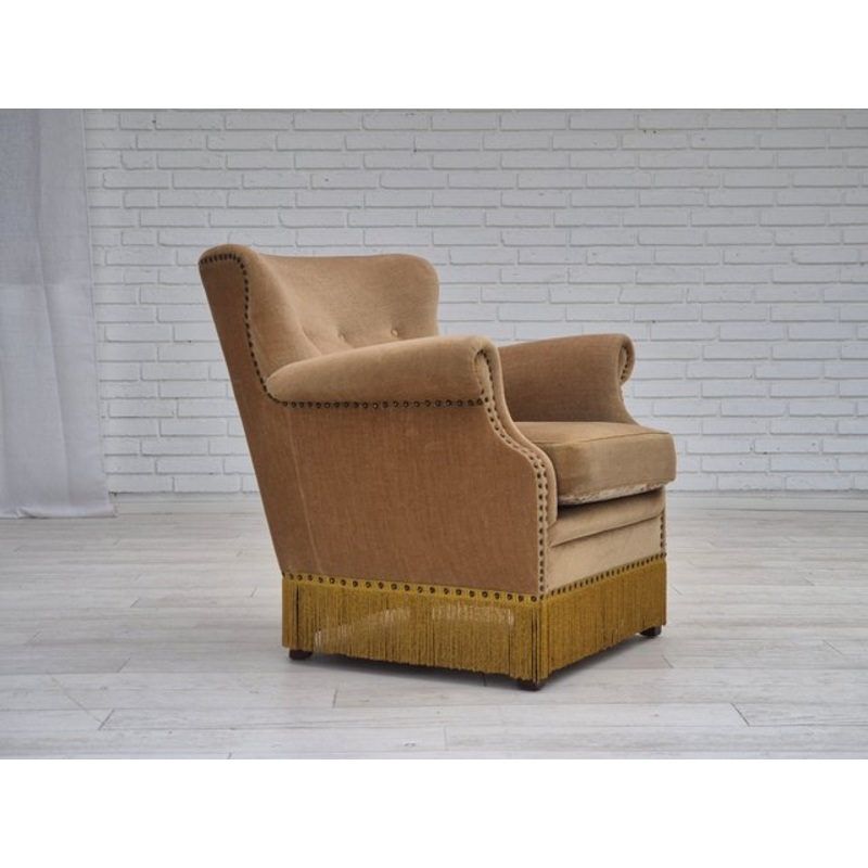 1960s, Danish lounge chair. Green furniture velour, springs in the seat cushion, beech wood legs, double sided seat cushion. Original very good condition: no smells, no stains and stable construction. Manufactured by Danish furniture maker in about 1960-65s. Original Scandinavian vintage design directly from Denmark. The chair was checked by craftsman.