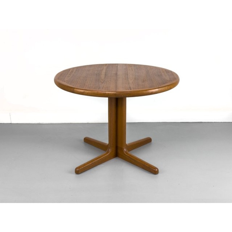 High-quality round teak dining table made of veneered table tops with solid wood edges, extendable with two leaves. Stable frame made of solid wood. When fully extended, the table offers space for 6-8 people. Manufacturer: Johs. (Johannes) Kristoffersen &