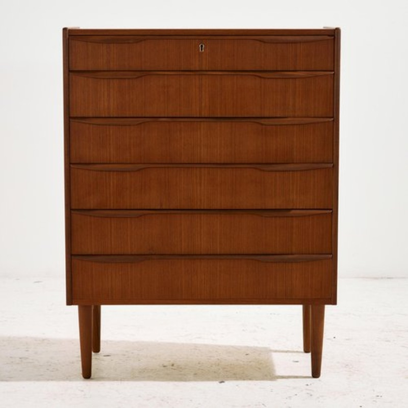 Restored Danish teak dresser with six drawers and unique handles from the 1960s. The key to the drawer is missing. Design Period 1960 to 1969 Production Period Before 2010 Style Vintage, Scandinavian Modern Detailed Condition Restored This vintage/antique