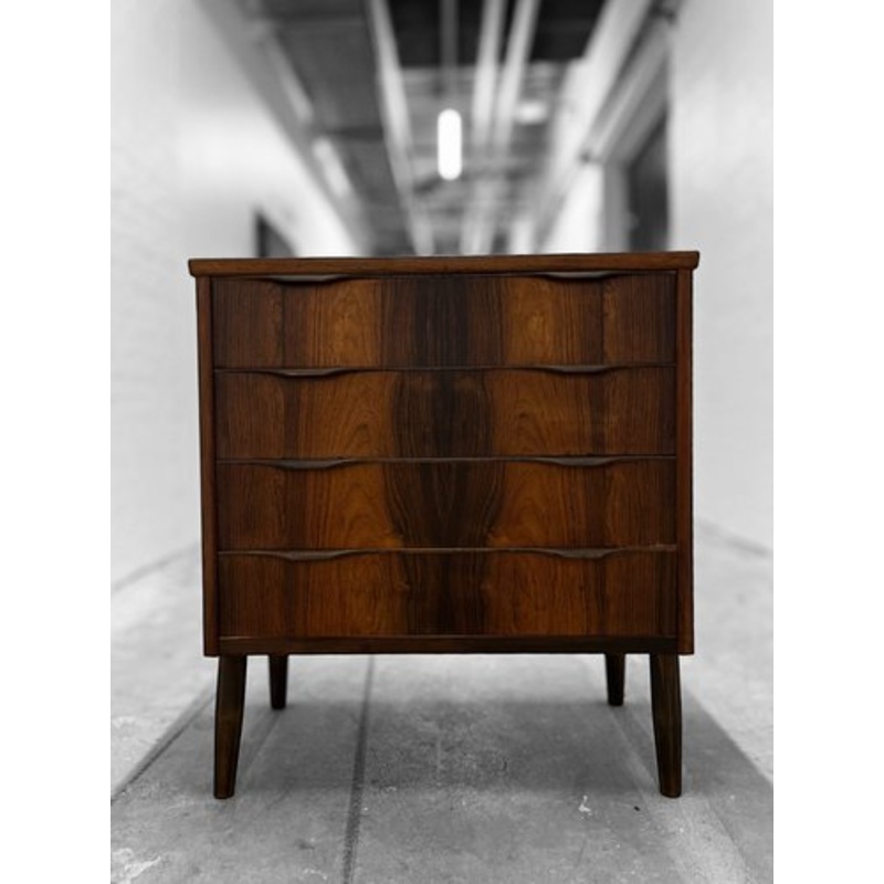 Petite Chest of Drawers Danish Design from the 1960sBeautiful and compact chest Four drawers with iconic wing-shaped handlesStands on slender, tapered legs Dimensions: H 68.5 cm W 63.5 cm D 34.5 cmPerfect for the living room, hallway, or as a bedside table
